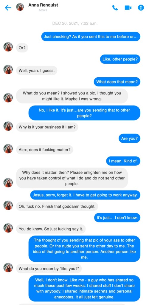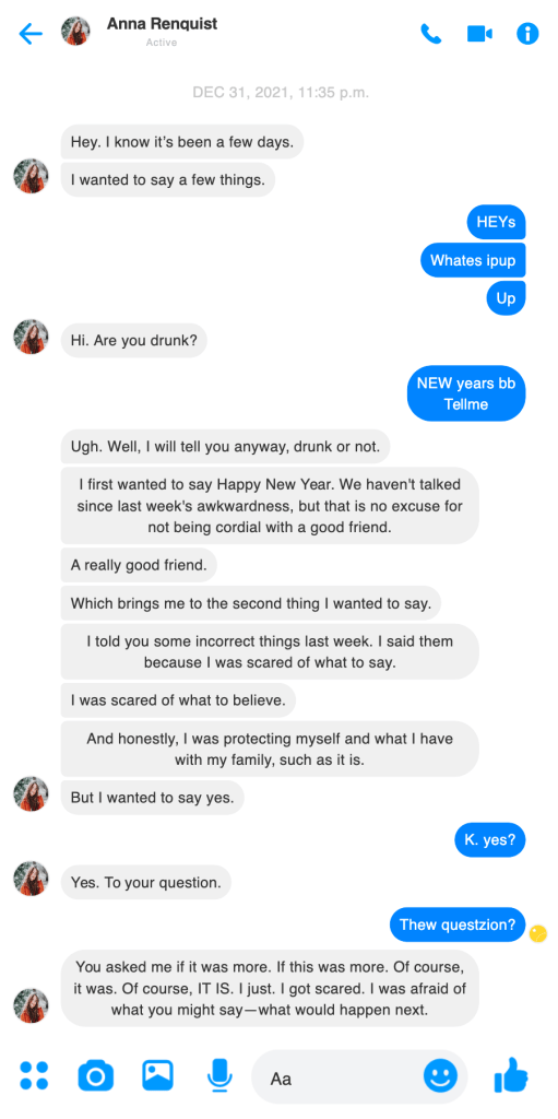 Alex could message her from his car’s ApplePlay if he had her cell phone number. When he asked Anna for her number the previous week, she said, “Absolutely not.” This “thing” was only a conversation transacted through Facebook Messenger. He wasn’t stoked about that but probably thought it best to play it safe, at least for their sake. Andrea was already suspicious of what he was doing on his phone all hours of the night. She probably had a similar situation with Rodney.