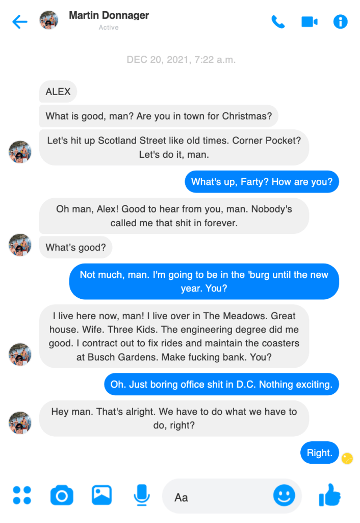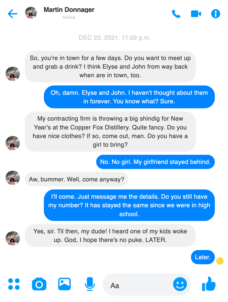 When he finally pulled his phone out, around midnight, sitting in his old bedroom, Alex saw a notification for Messenger on his phone. He nearly pulled a muscle opening the app, only to find it was his old friend from high school, Marty “Farty” Donnager. Alex and Marty worked together after high school at a fancy restaurant in town, Fat Canary, while saving money at community college. Eventually, Alex went to James Madison, while his dishwashing friend transferred to Old Dominion in Norfolk. It wasn’t who he wanted, yet Alex replied to Farty anyway. Maybe the sensation would feel like he was having his nightly conversation with Anna.