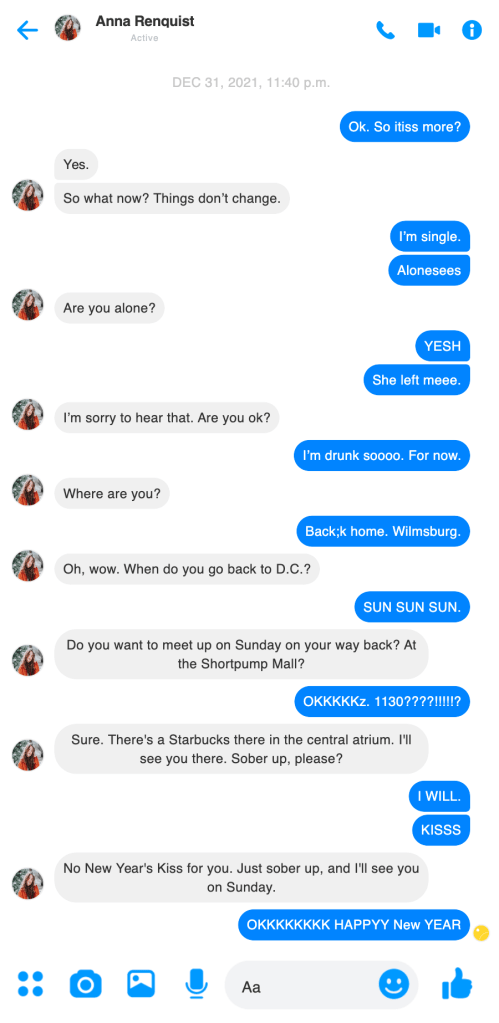 After Saturday’s recovery, Alex was ready for Sunday to leave and drive outside of Richmond to the Shortpump Mall and meet up with Anna. He didn’t think she would bring her husband and kid with him, at least not after what she said on New Year’s Eve. Yet the possibility of a husband meetup and subsequent beatdown was still on the table. The risk-reward scenario played and came up heads: he would proceed. The midnight puker extraordinaire spent most of Saturday hung over, rereading the messages from the previous day while sipping on blue Powerade and eating slightly stale crackers.