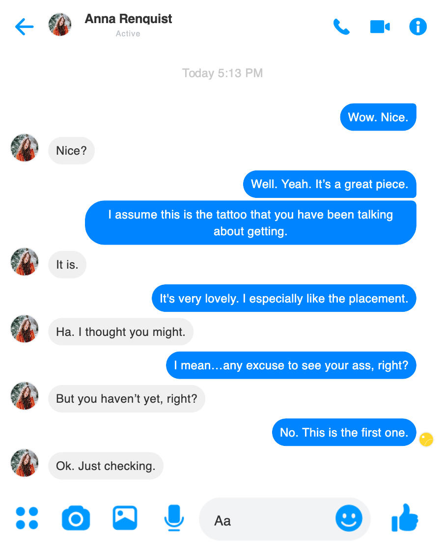 It was two weeks before Alex got another unsolicited photo of Anna. This time, it was her backside. He figured that particular shot might be coming because she kept talking about how she planned to see a tattoo artist to get a large piece done on her back. Anna told him to “wait and see” the exact spot on the backside of her body, so it was almost no surprise when she finally sent Alex a photo of her newest tattoo on his way into his office one cold Monday before Christmas.