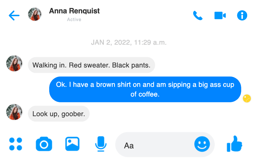 After scrolling through his phone for thirty minutes and taking a brief nap using his coat as a blanket, the mall finally opened. He went inside, found the Starbucks near the atrium, and messaged Anna on Messenger that he arrived. He got a venti drip coffee and sipped on it until she showed up. He thought the mall was surprisingly crowded for the Sunday after the new year. There were lots of families shopping in stores, perhaps using gift certificates they received over the holidays. He got a phone notification at 11:29 am from Anna.