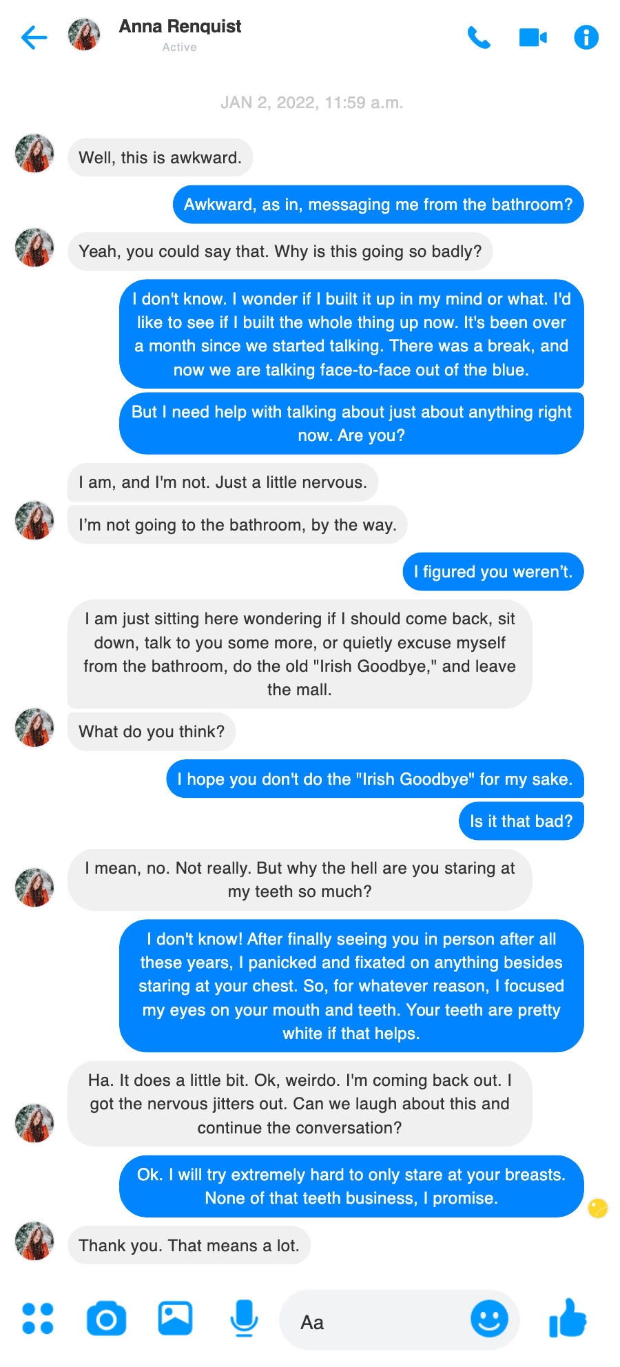 Anna came back to the table two minutes later. Alex faked like he would continue talking on Messenger before laughing and putting his phone away. They both laughed at that. Tensions loosened, and the conversation grew relaxed. They eventually managed to talk like they always had. A phone application no longer feels like a replacement or extension of their connection. It was there. It was happening at the moment. It felt real. Alex managed to look away from Anna’s teeth as requested. He did not stare at her chest, even if he joked about it once or twice early on in the conversation. Alex focused on her eyes and how they interacted as they talked. He thought that was something he could never duplicate talking to her online in the small hours.